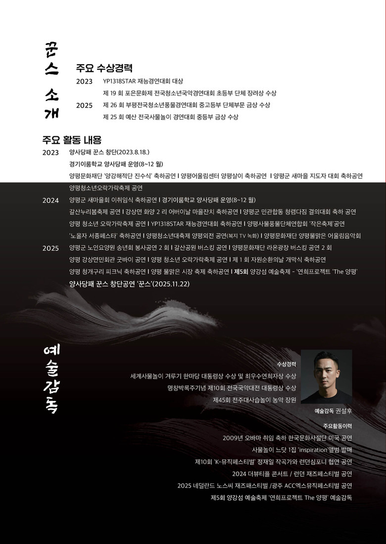 사물놀이 프로그램을 통해 실력을 키워온 ‘양사당패 꾼스’는 지난 1일 열린 제25회 예산 전국 사물놀이 경연 대회 학생부 경연에서 중등부 금상(충남교육감상)을 수상하며 우수한 기량을 입증했다. ‘꾼스’는 양평중학교 학생 8명과 강상초등학교 학생 1명으로 구성되어 있으며, 지역 예술인 및 마을과의 꾸준한 협력 속에서 전통예술을 깊이 있게 배우며 높은 평가를 받았다.