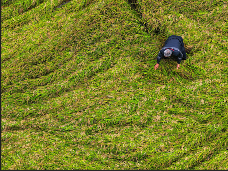 가을장마가 계속되고 있는 16일 경북 상주시 한 논의 벼가 비바람에 누워 있는 가운데 농민이 싹 틔운 벼 이삭(수발아)을 살펴보고 있다. 2025.10.16