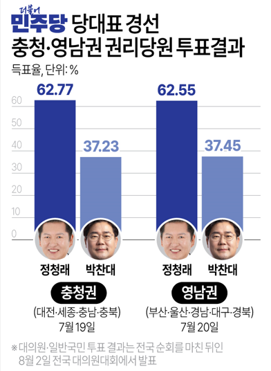 민주당은 이날 서울 여의도 중앙당사에서 전국 경선 두 번째 지역인 영남권(부산·울산·경남·대구·경북) 합동 연설회를 열고 권리당원 투표 결과를 발표했다.투표 결과 정 후보가 62.55% 득표율로 박 후보(37.45%)에 약 25%포인트 앞섰다.이로써 정 후보는 지금까지 치러진 두 번의 권역별 경선 모두 박 후보에 압승하면서 전대 초반 유리한 고지를 점한 모습이다.