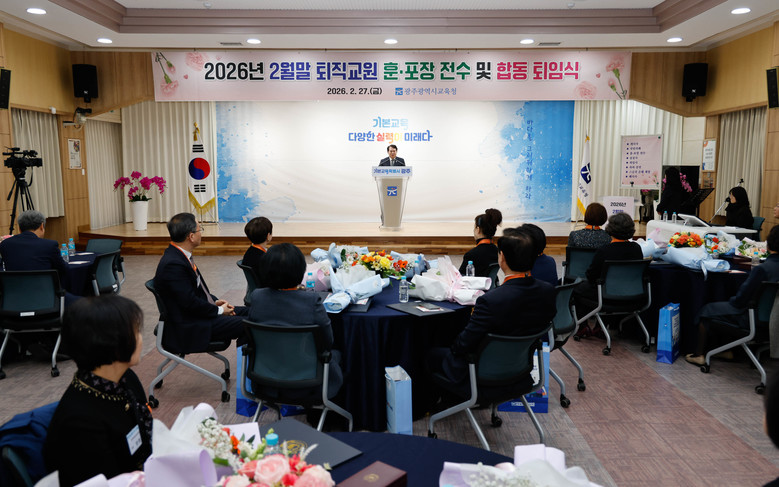 [광주 세계타임즈=손권일 기자] 광주시교육청(교육감 이정선)은 27일 본청 대회의실에서 2월 말 정년퇴직 교원과 8월 말 명예퇴직 예정 교원이 참석한 가운데 ‘퇴직교원 훈·포장 전수 및 합동 퇴임식’을 개최했다.