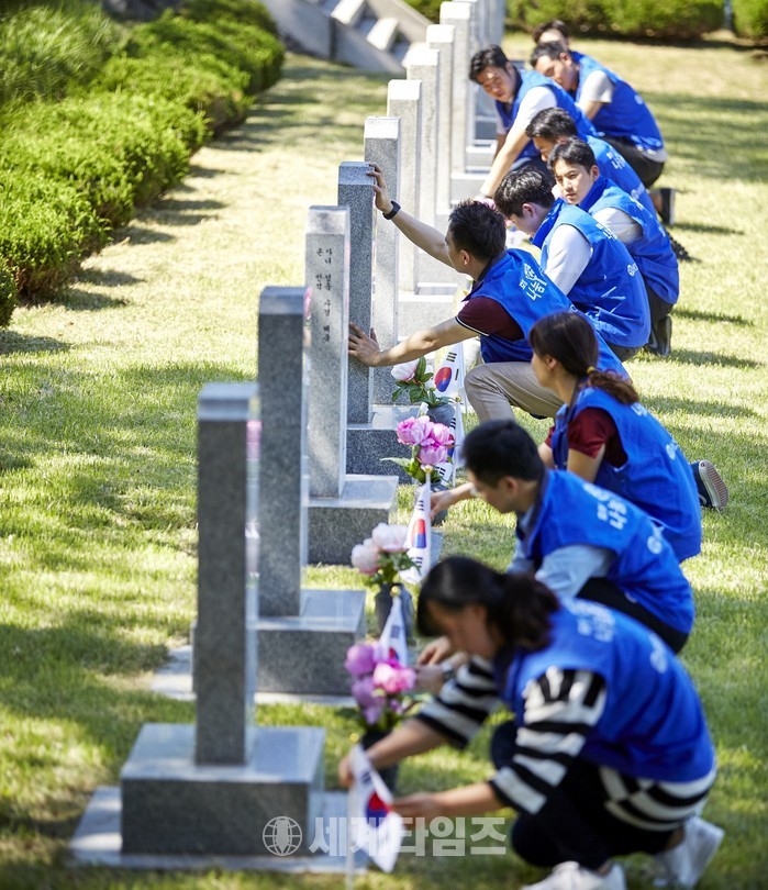 | ▲ © 세계타임즈 효성 임직원들이 2016년 5월 25일 국립서울현충원에서 묘역정화활동을 하고 있다. |