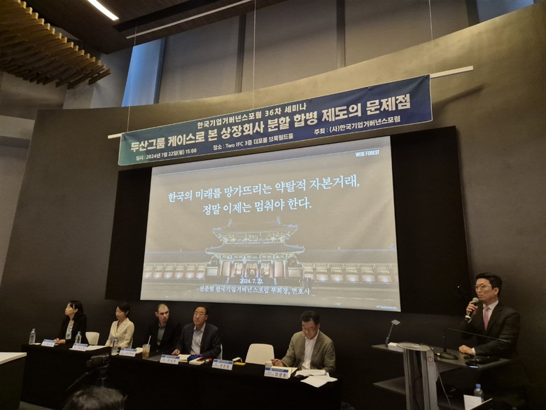 [세계타임즈 = 이채봉 기자] 주주권익 침해 논란이 일고 있는 두산그룹의 지배구조 개편을 금융당국이 나서서 엄격히 심사해야 한다는 주장이 금융투자 업계와 정치권에서 제기됐다.이번 사태 원인이 주권상장법인의 합병가액이 시가를 따라야 한다고 정한 현 자본시장법에 있다는 지적이 잇따랐으며, 한 외국인 기관투자자는 한국 시장에서는 이런 날강도같은 짓도 생길 수 있겠다는 깨달음을 얻었다며 거세게 비판했다.천준범 한국기업거버넌스포럼 부회장은 22일 여의도 국제금융센터(IFC)에서 열린 세미나에서 이번 분할합병·주식교환 증권신고서 검토 결과 두산에너빌리티, 두산밥캣 주주에게는 분할합병·주식교환으로 받게 될 두산로보틱스 주식의 초고평가 상태와 주가 하락 가능성이 가장 큰 핵심 위험 요소임에도 불구하고 대단히 추상적으로만 기재되고 제대로 고지되지 않았다고 지적했다.천 부회장은 특히 증권신고서 내에서 로보틱스의 사업 분야인 협동로봇 시장의 성장성이 높지 않음을 명확히 고지했으므로 이러한 시장 환경에 비추어 현재의 주가 수준에 대한 객관적 정보를 제공할 필요가 있다며 이런 부실기재는 증권신고서상 중요 사항 누락에 해당한다고 강조했다.