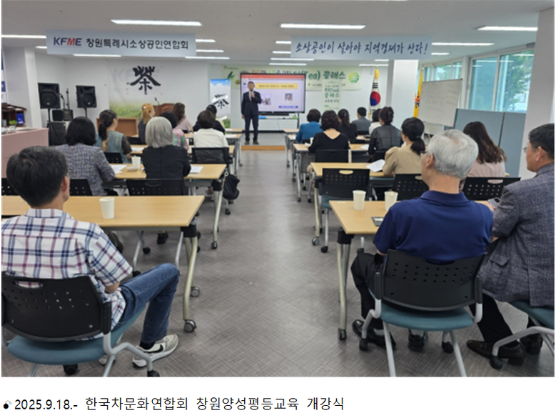 [세계타임즈]최성룡기자 = 사단법인 한국차문화연합회(회장 고성배)는 16일 경상북도 경산지부 제1기 연수회 수료식에 이어 18일에는 창원시소상공인연합회 교육장에서 여성의 사회 참여를 위한 ’힐링과 소통을 위한 티(Tea)클래스’ 개강식을 가졌다.