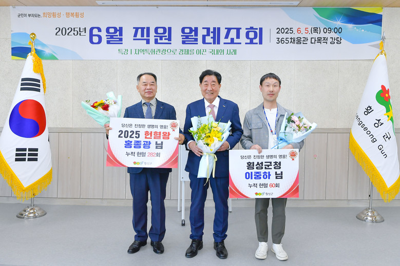 한편, 횡성군은 안정적인 혈액 수급을 위해 대한적십자사 강원혈액원과 협력해 헌혈 캠페인을 펼치고 있으며, 2분기 생명나눔 사랑의 단체헌혈은 오는 6월 11일 횡성군청 주차장 내 헌혈버스에서 오전 9시 30분부터 오후 4시까지 진행될 예정이다.