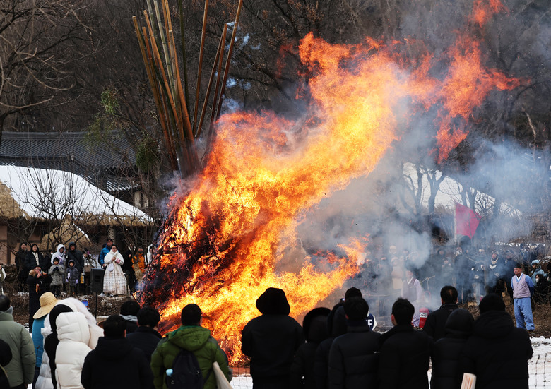 [세계타임즈 = 송민수 기자] 9일 오후 경기도 용인시 한국민속촌에서 열린 정월대보름 달집태우기 행사에서 시민들이 타오르는 달집을 바라보고 있다. 2025.2.9
