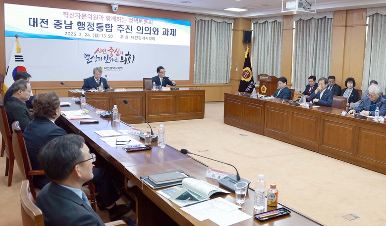 대전시의회는 조원휘 의장 주재로 24일 대전시의회 소통실에서 대전충남 행정통합 추진 의의와 과제를 논의하기 위해 ‘혁신자문위원과 함께하는 정책토론회’를 열었다.