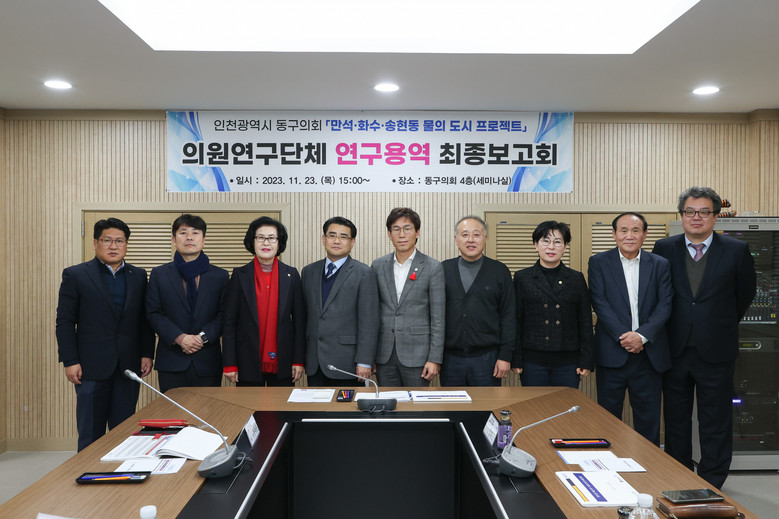 [동구 세계타임즈=심하린 기자] 인천 동구의회 의원연구단체『만석·화수·송현동 물의 도시 프로젝트』가 23일 동구의회 세미나실에서‘동구 해안 친수시설 관리 및 이용방안’연구용역과 관련하여 최종보고회를 개최했다.