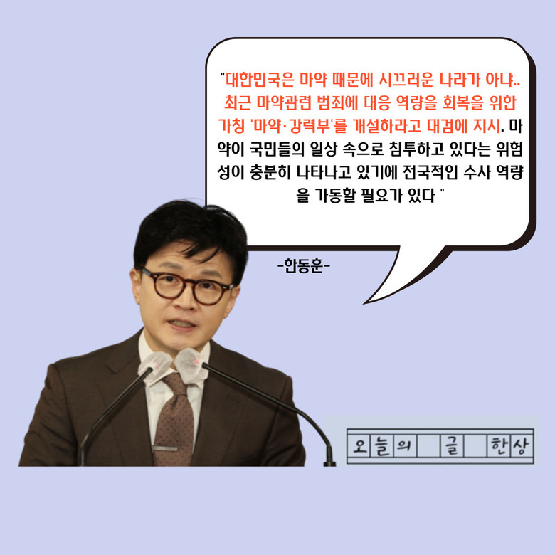 특히 이 발언과 함께 한 장관은 강남 대치동 학원가에서 발생한 '마약 음료' 사건을 두고 "지금 현재 국내에서 마약이 국민들의 속으로 침투하고 있다는 것을 보여주는 범죄이기에 하루라도 빨리 수사 역량을 가동할 필요가 있다"며 이같이 말했다.