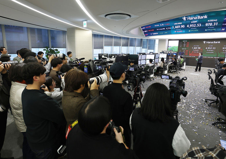 [세계타임즈 = 이현진 기자] 코스피가 22일 미국의 유럽에 대한 관세 철회 소식에 상승해 장중 사상 처음 5,000선을 '터치'했다.이날 코스피는 전장보다 42.60포인트(0.87%) 오른 4,952.53에 거래를 마치며 종가 기준 역대 최고치를 기록했다.지수는 전장보다 77.13포인트(1.57%) 오른 4,987.06으로 출발해 상승폭을 키워 장 초반 역대 처음 5,000선을 넘어섰다. 한때 5,019.54까지 오르기도 했다.지난해 10월 사상 처음 4,000선을 돌파한 지 3개월 만에 그간 '꿈의 지수'로 불렸던 '오천피'(코스피 5,000) 고지마저 넘어선 것이다. 이후 차익 실현 매물에 오름폭은 일부 축소됐다.이날 오후 3시 30분 기준 서울 외환시장에서 달러 대비 원화 환율은 전날보다 1.4원 내린 1,469.9원을 나타냈다.