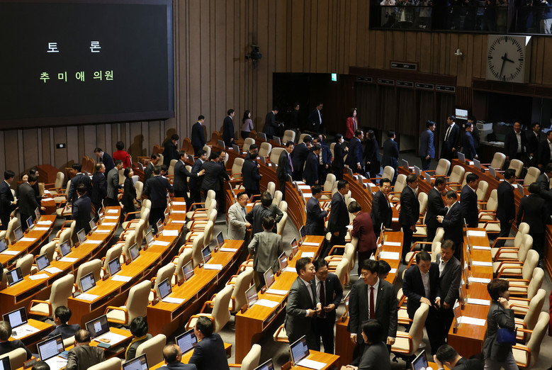국민의힘 의원들이 14일 서울 여의도 국회 본회의에서 검건희 여사 특검법이 상정되자 퇴장하고 있다. 2024.11.14