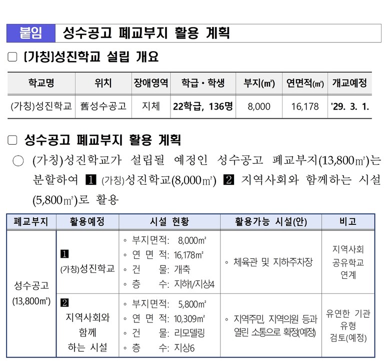 성수공고 폐교 부지(13,800㎡)는 분할하여 ① (가칭)성진학교(8,000㎡), ② 지역사회와 함께하는 시설(5,800㎡)로 활용할 계획이다.