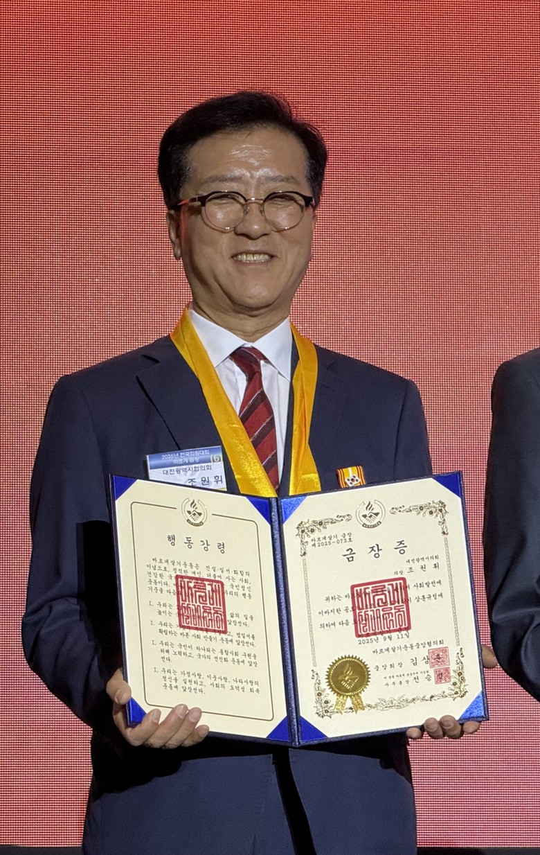 [대전 세계타임즈=이채봉 기자] 대전광역시의회 조원휘 의장이 11일 ‘2025 바르게살기운동 전국 회원대회’에서 바르게살기운동 중앙협의회로부터 ‘바르게 금장’을 받았다.