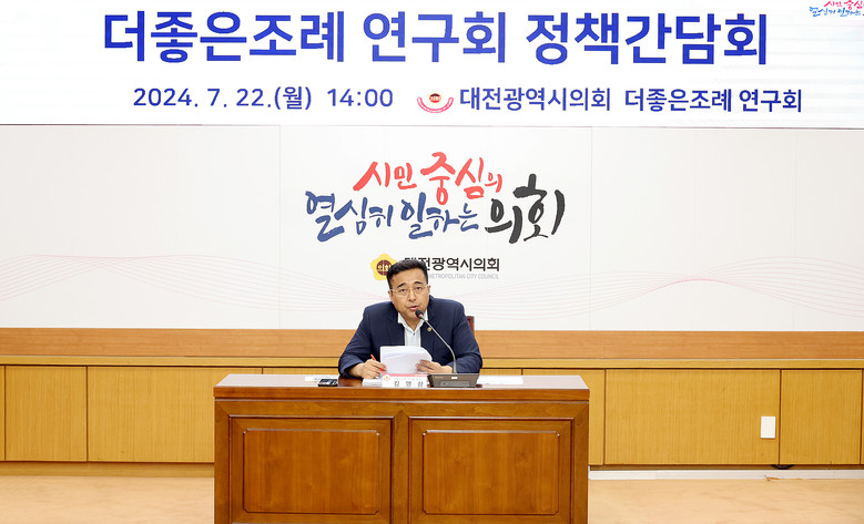 [대전 세계타임즈=백택기 기자] 대전시의회 김영삼 의원(서구2, 국민의힘)이 회장을 맡은 ‘더좋은 조례 연구회’가 22일 시의회 소통실에서 간담회를 개최했다. 본 연구회는 대전시의 조례 정비를 통해 주민 불편을 해소하고 조례의 품질을 제고해 지방분권 강화를 위한 기반을 마련하고자 2024년 2월부터 조직되었다.