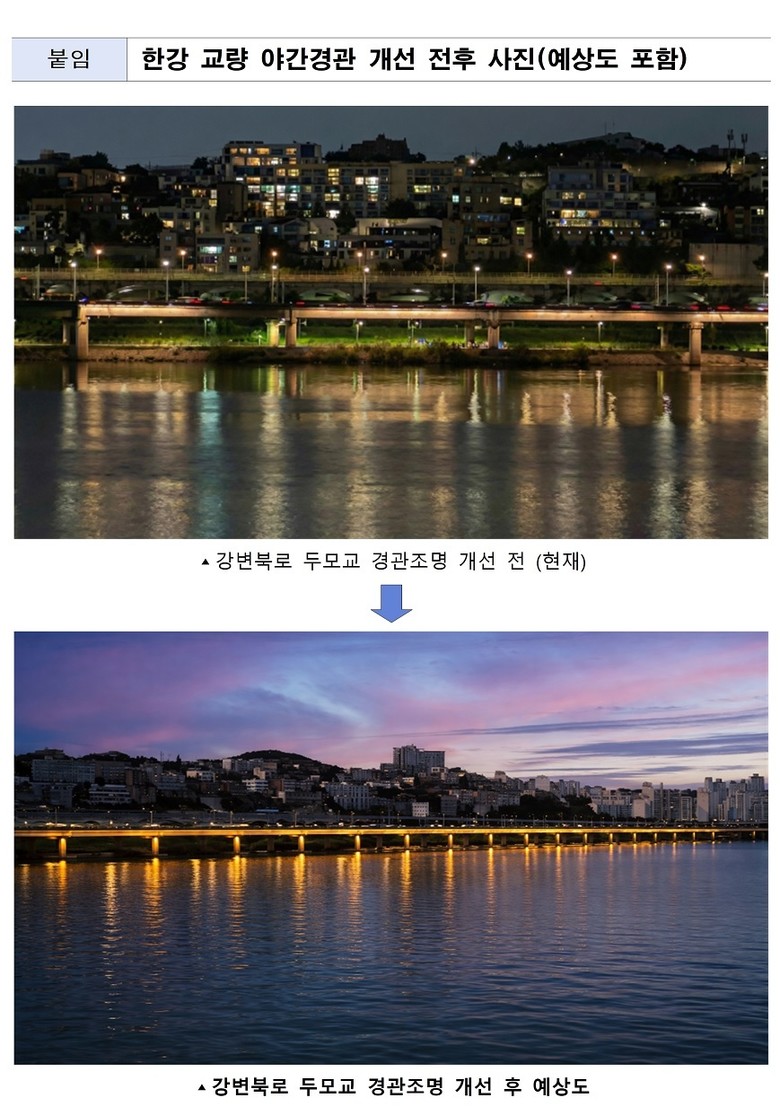 한편, 서울시는 한강 교량 경관조명의 약 68%가 설치 후 20년 이상 경과해 밝기 저하와 경관 저해 문제가 구조적으로 발생하고 있다고 보고, 2024년 ‘한강교량 경관조명 개선 기본계획’을 수립해 체계적인 개선을 추진하고 있다.