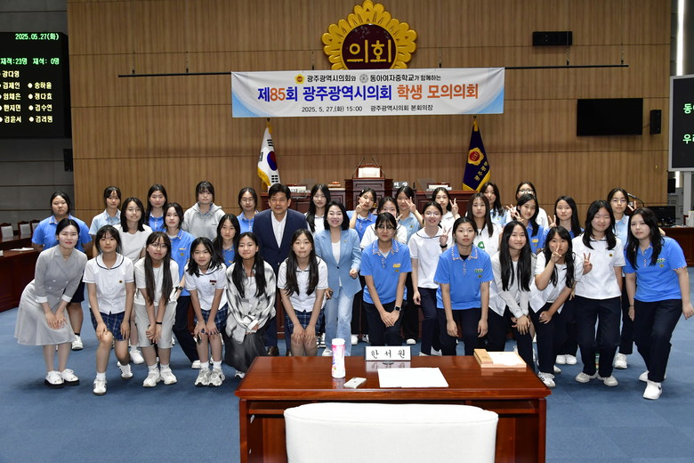 - 동아여자중학교, 학생자치 활성화를 위한 실천 조례안 제정 [광주 세계타임즈=손권일 기자] 광주광역시의회(의장 신수정)는 26일, 27일 이틀간 시의회 본회의장에서 우산중학교와 동아여자중학교 학생들을 대상으로 ‘광주광역시의회 학생 모의의회’를 개최했다.