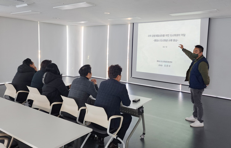 이날 벤치마킹에 참여한 의원들은 오은석 통영시 도시재생지원센터장으로부터 통영시 도시재생사업 현황 등을 청취하고, 통영 봉평지구 도시재생사업의 마중물 사업으로 조성한 데메마을 당산나무 복합문화공간을 직접 방문해 현장을 둘러봤다.