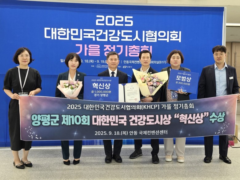 [양평군 세계타임즈=송민수 기자] 양평군(군수 전진선)은 18일부터 19일까지 경북 안동시 안동국제컨벤션센터에서 열린 제21회 대한민국건강도시협의회 정기총회에서 ‘2025 대한민국 건강도시상 혁신상’을 수상했다고 밝혔다.