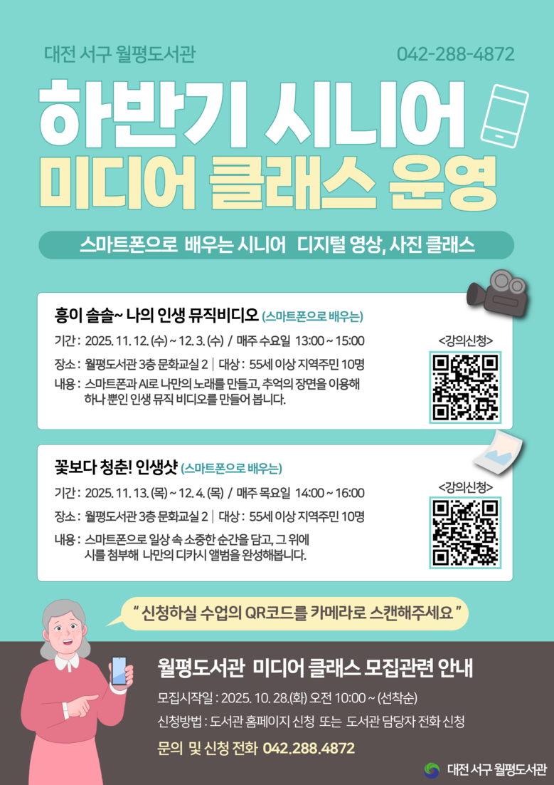 수강료는 무료이며, 스마트폰을 활용한 미디어 제작에 어려움을 느꼈던 55세 이상 주민이라면 누구나 참여할 수 있다. 신청은 월평도서관 홈페이지 행사 및 강좌 신청란 또는 전화로 가능하며, 이달 28일 오전 10시부터 접수한다. 기타 자세한 사항은 월평도서관(☎042-288-4872)으로 문의하면 된다.