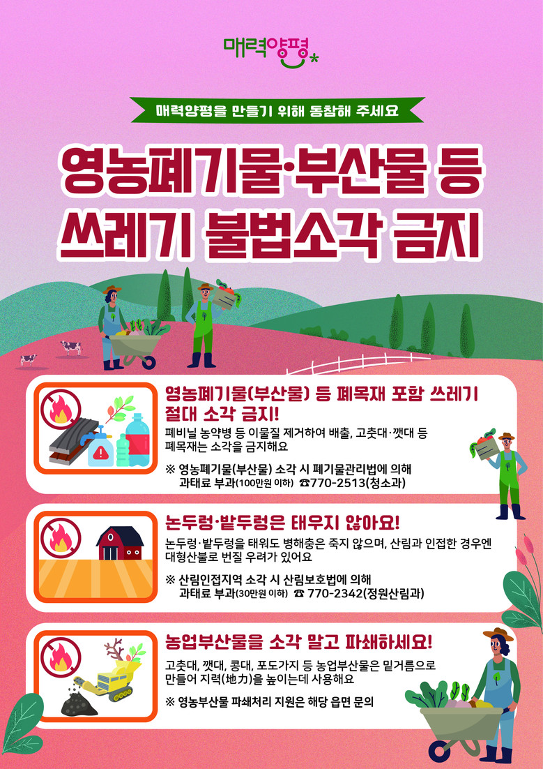불법투기 감시원들은 논·밭두렁과 영농부산물 발생 지역을 중심으로 불법소각 행위를 집중 점검할 예정이며, 적발 시 산림보호법에 따라 50만 원 이하, 폐기물관리법에 따라 100만 원 이하의 과태료를 부과할 방침이다.