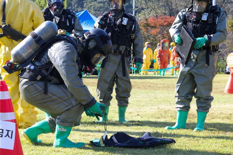 제24회 대청호마라톤대회 현장을 배경으로 드론을 이용한 탄저균 살포 가상상황을 설정해 △의심신고 및 상황전파 △초동대응팀 출동·현장통제 △다중탐지키트 검사·검체 채취 △노출자 제독·의료이송 △언론브리핑 등 매뉴얼(manual)에 따른 실전형 시나리오로 진행됐다.