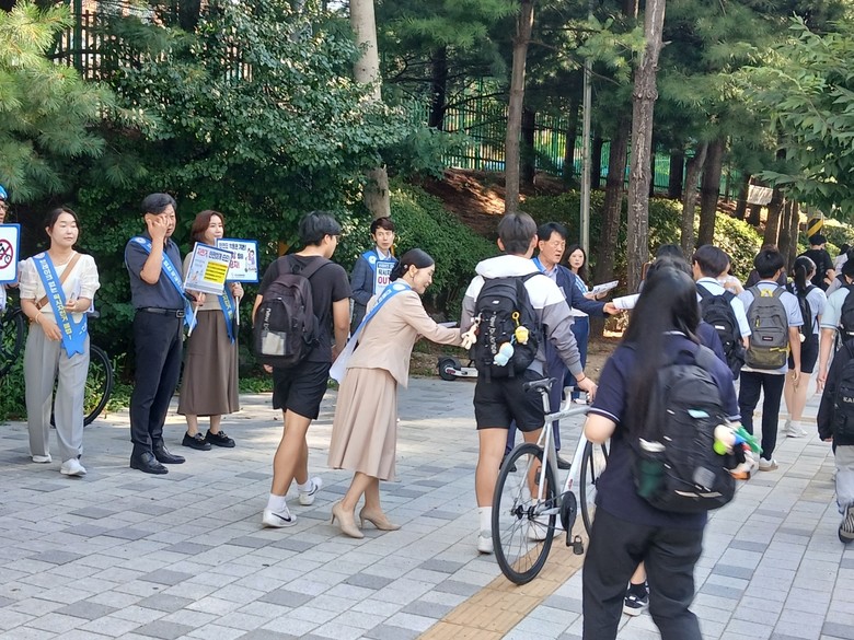 캠페인에는 김선경 교육장과 교육지원청 직원들이 참여해 학생들에게 ▲픽시자전거 및 PM의 위험성 ▲ 올바른 이용 규칙 ▲ 교통규칙 준수사항 등을 안내했다.