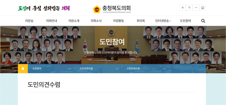제출 방법은 충북도의회 홈페이지(council.chungbuk.kr)→ 도민참여→ 도민의견수렴 게시판을 이용하면 된다.