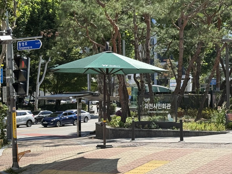 | ▲ 중앙동 과천시민회관 앞 신규 설치된 고정형 그늘막 |