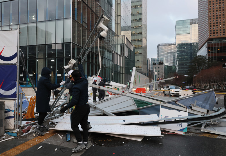 [세계타임즈 = 이장성 기자] 27일 오후 서울 종로구 KT 광화문 사옥 리모델링 현장에서 를 관계자들이 철거하고 있다. 2025.1.27