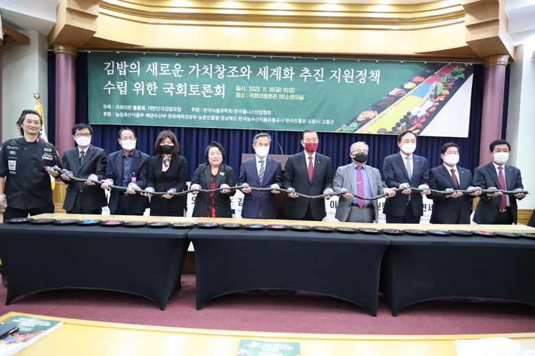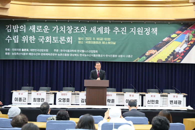 이어 홍문표의원은 “김밥은 최근 드라마 ‘이상한 변호사 우영우’의 인기와 더불어 전세계적으로 강력한 신드롬을 만들어내며 우리나라를 대표하는 음식으로 주목 받고 있다.“ 며 ”김밥이라는 신한식이 전세계인의 사랑을 받을 수 있는 대표적 아이콘이 되도록 그 기반 플랫폼 조성에 필요한 다양한 지원을 아끼지 않겠다“고 말했다.