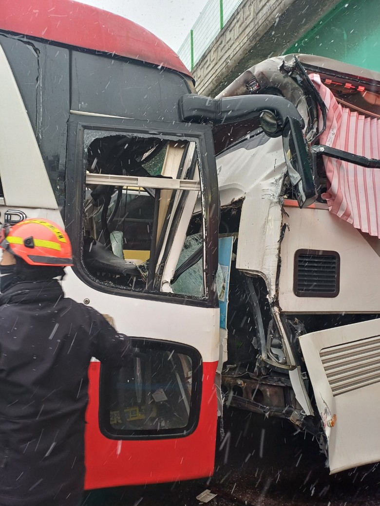 [세계타임즈 = 이현진 기자] 27일 오후 경부고속도로 부산 방향 천안IC 부근에서 승용차와 고속버스 2대 등이 3중 추돌했다. 사진은 사고 버스 모습. 2025.1.27 [천안동남소방서 제공. 재판매 및 DB 금지]