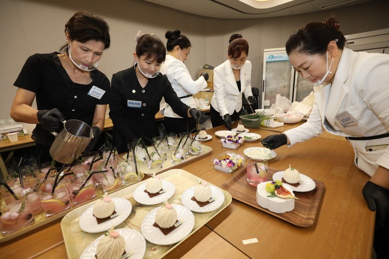 ▲지난 18일 HWPL 9·18 평화 만국회의 제9주년 기념식 행사장에서 HWPL 다과부 스태프들이 디저트와 음료를 준비하고 있다.