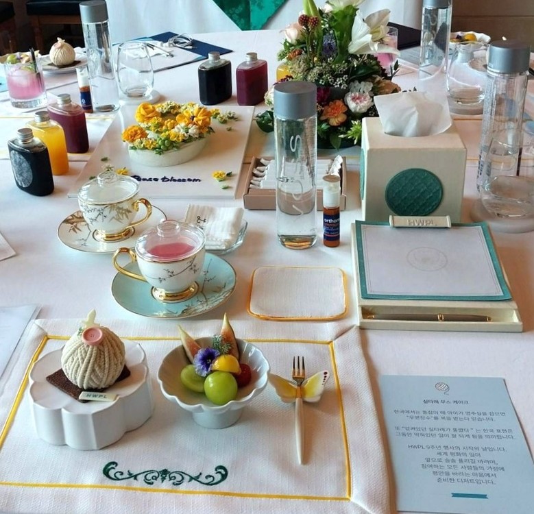 | ▲지난 18일 HWPL 9·18 평화 만국회의 제9주년 기념식 행사장에서 HWPL 다과부가 준비한 실타래 무스 케이크와 센터피스가 플레이팅돼 있다. |