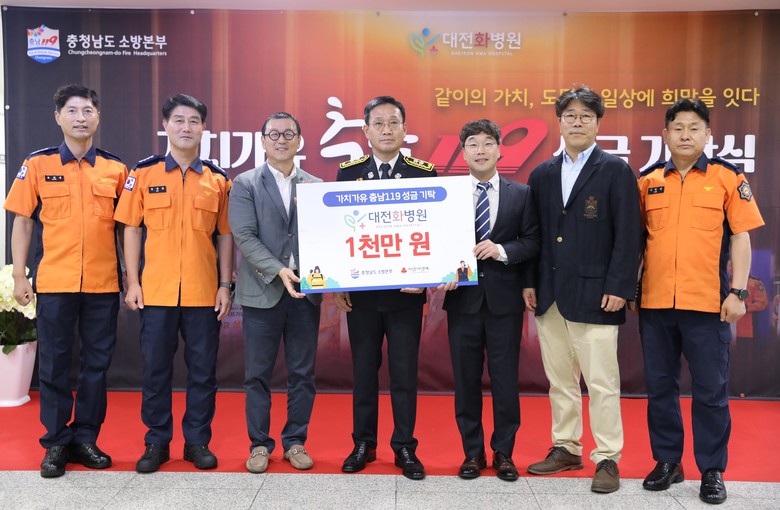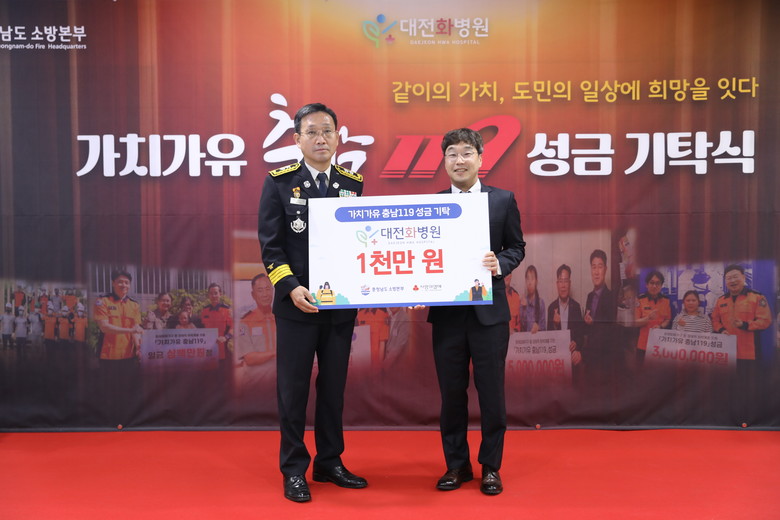 가치가유 충남119 성금 사업은 도 소방공무원과 의용소방대원이 하루 119원씩 모아 재난·사고·질병 등으로 어려움을 겪는 도민을 지원하는 것으로, 이번 성금 기탁은 대전화병원이 이러한 사업 취지에 공감하면서 이뤄졌다.