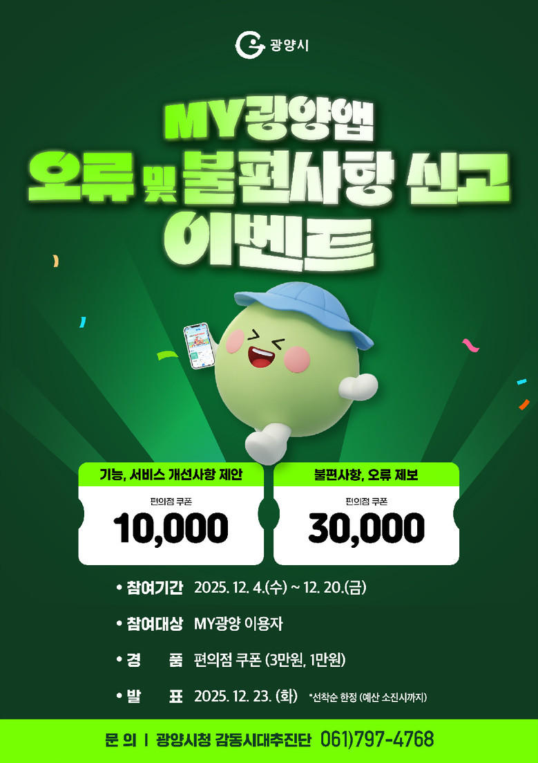 시는 지난 5월 22일 「MY광양」 앱 정식 오픈 이후 지속적으로 기능 개선을 추진해 왔으며, 오류를 제로화하고 사용자 관점에서의 불편사항을 개선해 서비스 품질을 높이고자 이번 이벤트를 마련했다.