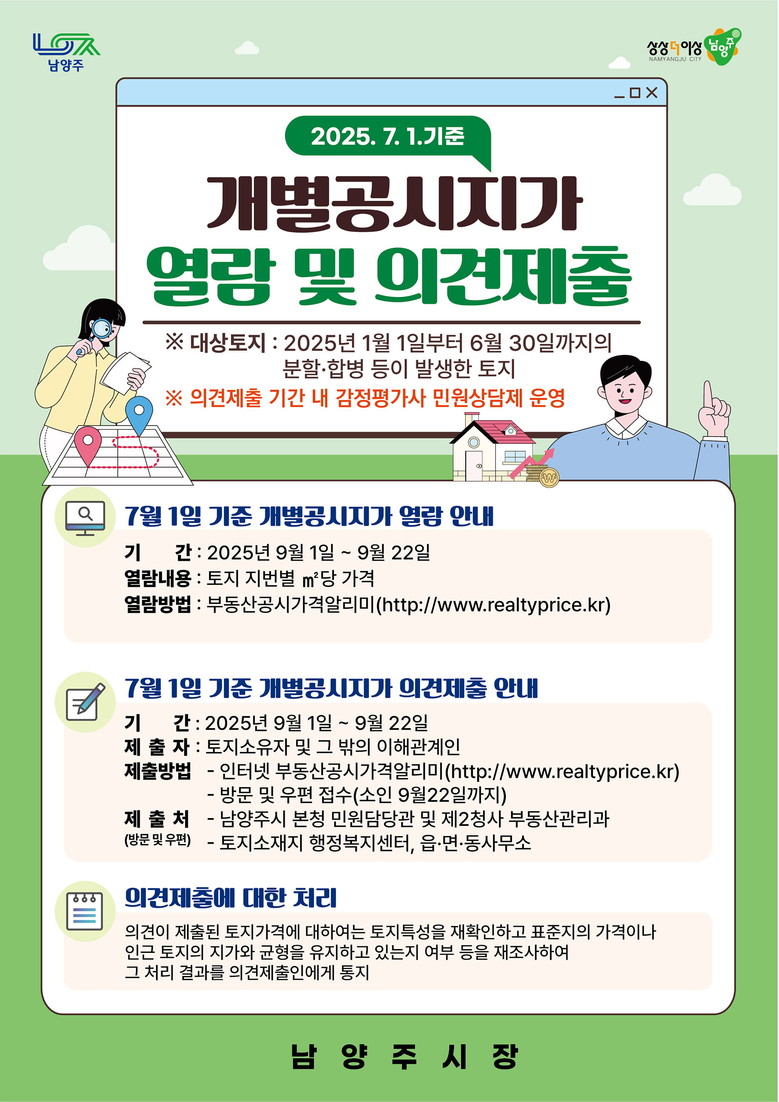시는 의견이 제출된 토지를 표준지 및 인근 토지와의 가격 균형 여부 등을 재조사해 감정평가사 검증 및 남양주시 부동산가격공시위원회 심의를 거쳐 결과를 개별 통지할 예정이다.