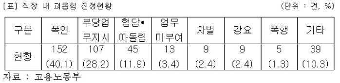 김나윤의원이 자료를 분석한 결과, 직장 괴롭힘을 금지하는 근로기준법 개정안이 시행된 7월 16일부터 8월 16일까지 전국에서 총 379건의 진정이 접수됐다.