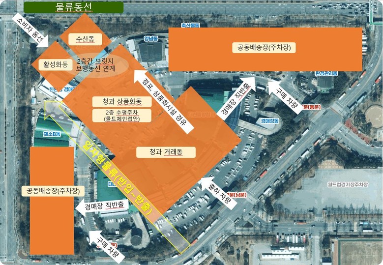 사업의 주요 개선 방향은 ▲농산물 반입·반출장 분리와 일방향 물류동선 구축 ▲경매장과 중도매인 점포 기능별 분리 신축 ▲선별·소분·포장·배송이 원스톱으로 가능한 상품화·풀필먼트 기능 도입 ▲공동 배송장 신설을 통한 물류 효율화 등이다.