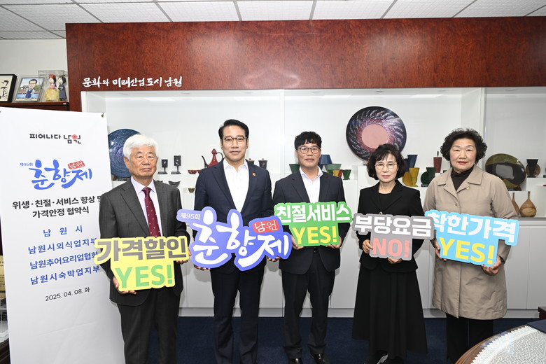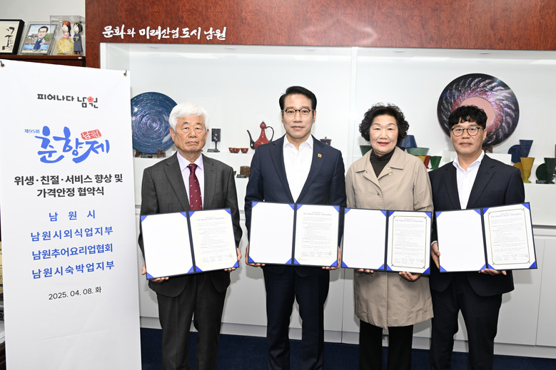 [세계타임즈=남원시 신승민 기자] 남원시(시장 최경식)는 4월 30일부터 5월 06일까지 개최되는 제95회 춘향제를 앞두고 한국외식업중앙회 남원시지부(이하 남원시외식업지부), 남원추어요리업협회, 대한숙박업중앙회 남원시지부와 춘향제 행사의 성공적인 개최 및 지역경제 활성화를 위하여 4월 8일(화)에 협약을 가졌다.