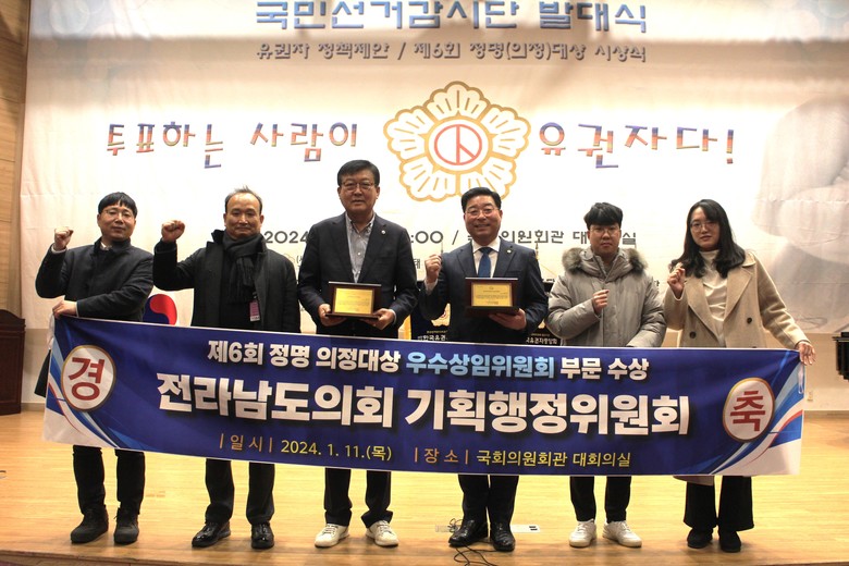 [전남 세계타임즈=우덕현 기자] 전라남도의회 기획행정위원회(위원장 신민호)가 1월 11일 한국유권자중앙회가 주관하는 '정명(正ㆍ明)의정대상' 에서 ‘우수 상임위원회’로 선정됐다.