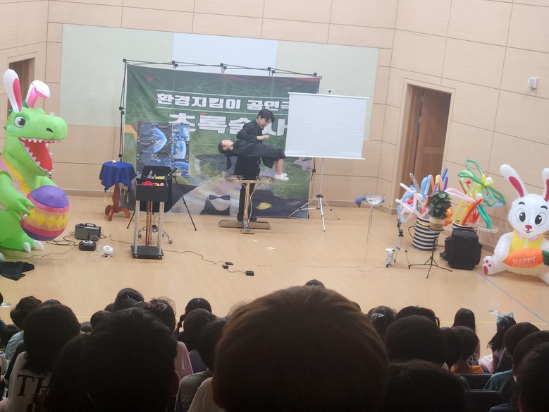 ‘환경마술공연’은 비둘기 마술을 시작으로 재활용 챌린지 공연, 지구 안에 우리 화석에너지와 우리 그리고 지구에 대한 마술공연, 오목 게임을 통해 지구 사진이 맞추어지는 마술, 레이져 쇼로 이루어졌고 공연 마지막에는 화려한 풍선아트로 어린이의 눈과 귀를 사로잡았다.