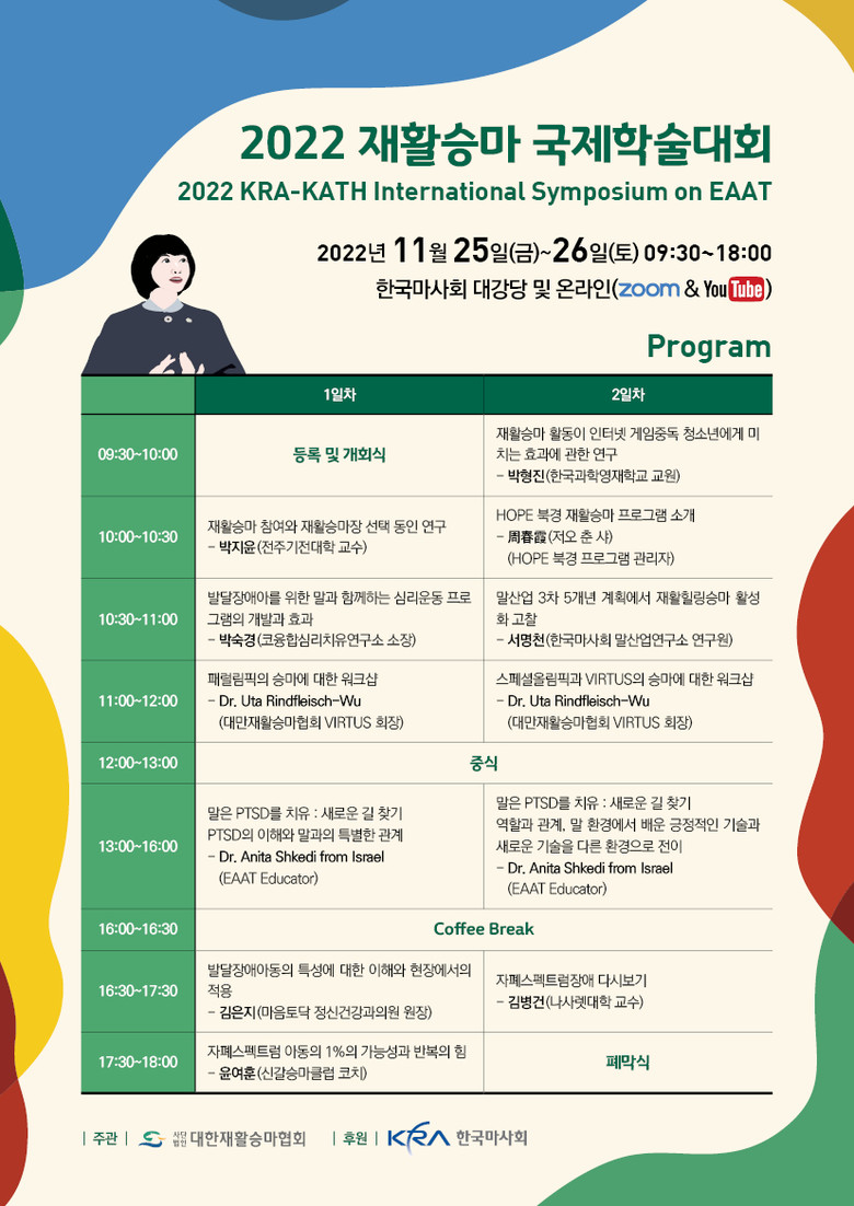 첫째 날에는 개회식에 이어 ‘재활승마 참여와 재활승마장 선택 동인 연구’에 대하여 박지윤 전주기전대학 교수가 첫 번째 발표자로 나선다. 이 외에도 ‘발달장애아를 위한 말과 함께하는 심리운동 프로그램의 개발과 효과(박숙경 코융합심리치유연구소 소장)’, ’자폐스펙트럼 아동의 1%의 가능성과 반복의 힘(윤여훈 신갈승마클럽 코치)‘ 등 다양한 분야에 걸쳐 학술 발표가 이어진다.