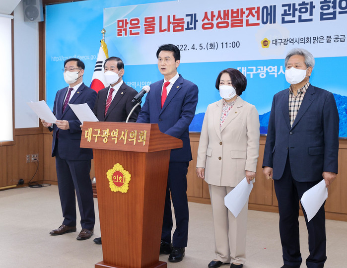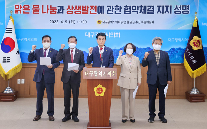 이에 대해 대구시의회는 5일(화) 시의회 2층 간담회장에서 맑은 물 공급 추진 특별위원회(위원장 박우근) 명의의 성명을 발표하며 협약 체결을 지지하고 사업의 성공적인 추진을 위한 협력을 다짐했다.