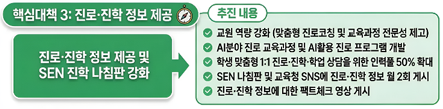 아울러 초중등 AI 분야 진로 교육과정 및 AI 활용 진로프로그램을 개발하고, 대학진학지도지원단 연구 활성화를 통해 진로·진학 정보 상시 제공 체계를 구축한다. 또한 쎈(SEN)진학 나침판 및 교육청 SNS에 정보를 월 2회 게시하고, 잘못된 진로·진학 정보에 대한 팩트 체크 영상도 추가 제작 예정이다