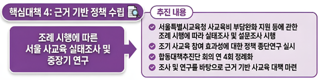 ④ 조례 시행에 따른 실태조사 및 합동대책추진단 정례회로 근거 기반 정책 수립 [서울 세계타임즈=이장성 기자] 서울특별시교육청(교육감 정근식)은 서울시 사교육비 부담을 완화하기 위해 「사교육 경감 4대 대책」을 추진한다.