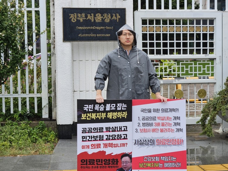 [세계타임즈 = 이장성 기자] 정부가 불합리한 의료정책으로 전공의들을 필수 의료에서 이탈시킨 것처럼, 불합리한 의료정책은 의료소비자, 혹은 일반 국민을 민영 영역으로 이탈시킬 것입니다.지역 종합병원 응급실 의사인 김찬규 씨는 5일 광화문 정부서울청사 앞에서 정부의 의료개혁정책을 의료민영화 정책이라고 규탄하며 1인 시위를 벌였다.김 씨는 올해 초까지만 해도 대학병원 응급의학과 3년 차 레지던트였지만, 정부의 의료정책에 문제의식을 느껴 병원에 사직서를 제출했다.김 씨는 전공의 집단사직과 응급실 대란 등 현재 병원에서 벌어지는 일련의 문제가 정부의 책임이라는 점을 재차 강조했다.의정 사태의 책임자가 전공의라고 하는 것은 저출생의 책임자를 젊은 여성, 민영화의 책임자를 시민이라고 주장하는 꼴이라고 꼬집으면서 의정 사태로 인한모든 책임은 정부가 져야 하고, 책임의 주체는 보건복지부 장관이라고 생각한다고 말했다.김 씨는 정부의 의료정책이 의료민영화를 초래할 것이라고 주장했다.필수 의료와 지방 의료를 살린다는 명목으로 정부가 추진하는 의료 개혁은 사실상 의료민영화의 과정이라며 정부가 건강보험 지속가능성을 위해 추진한다는 가치기반 지불제도도 한 사람당 소비되는 의료비의 총지출을 제한해 과소진료를 유발하고, 이는 결국 소비자를 민영보험으로 눈 돌리게 할 것이라고 강조했다.가치기반 지불제도는 60세, 고혈압, 당뇨, 고지혈증이 있는 환자가 고열로 병원을 찾으면 이 환자에게 들어갈 의료비 총지출액이 173만원이라는 식으로 정하는 제도다.이 때문에 의사가 과소진료를 하게 되고, 국민은 대안을 찾기 위해 큰 병원이나 다양한 병원에 다니고 싶다는 욕구를 해소하고자 사보험이나 민영보험으로 눈을 돌리게 된다는 것이 김 씨의 주장이다.김 씨는 이러한 정부의 의료정책으로부터 의료소비자의 권익을 보호하기 위해 지난달 중순 간호사, 한의사, 교사, 작가, 직장인 등 비의료인들과 함께 병원 다니는 사람들이라는 이름의 의료소비자단체를 만들었다.이번 의정 사태에서 의사, 간호사, 환자, 정부 관료 등 여러 직역 간 갈등이 있었는데, 사실 그 사이에서 가장 외면받고 목소리를 내지 못하는 집단이 의료소비자라고 돌아봤다.의료소비자는 직역 단체가 된 환자와 달리 언제든 병원에 갈 수 있고 의료 공공보험에 기여하는 직장인 등 건강보험 가입자라며 의료소비자의 권익을 대변할 필요가 있고, 의료인의 역할이 있다고 생각해 단체를 만들게 됐다고 전했다.