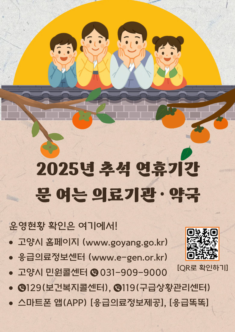연휴 중 운영하는 의료기관 및 약국 현황은 ▲응급의료정보센터(www.e-gen.or.kr), ▲고양시청 누리집(www.goyang.go.kr), ▲고양시 민원콜센터(031-909-9000)를 통해 확인할 수 있다.