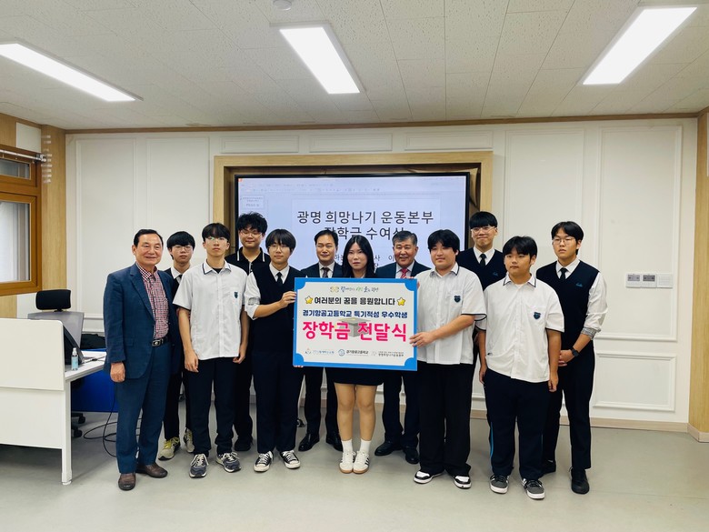 [광명시 세계타임즈=송민수 기자] 서울·경기 유일의 항공 특성화고등학교인 경기항공고등학교(교장 유형진)는 2025년 9월 18일(목), 광명희망나기 운동본부와 함께하는 교회로부터 기부받은 총 600만 원의 장학금을 학생들의 학업과 꿈을 응원하기 위해 수여했다.