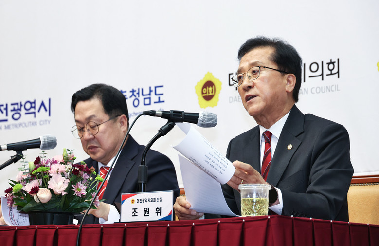 이날 조원휘 의장은 이장우 대전시장과 김태흠 충남지사, 홍성현 충남도의회 의장과 함께 대전시와 충남도를 통합하는 ‘통합 지방자치단체’ 출범 추진을 위한 공동 선언문에 서명했으며, 대전시와 충남도는 이번 공동 선언을 통해 수도권 일극 체제 극복과 지방소멸 대응을 위한 통합 지방자치단체를 설치 특별법 제정 논의를 본격화 할 계획이다.