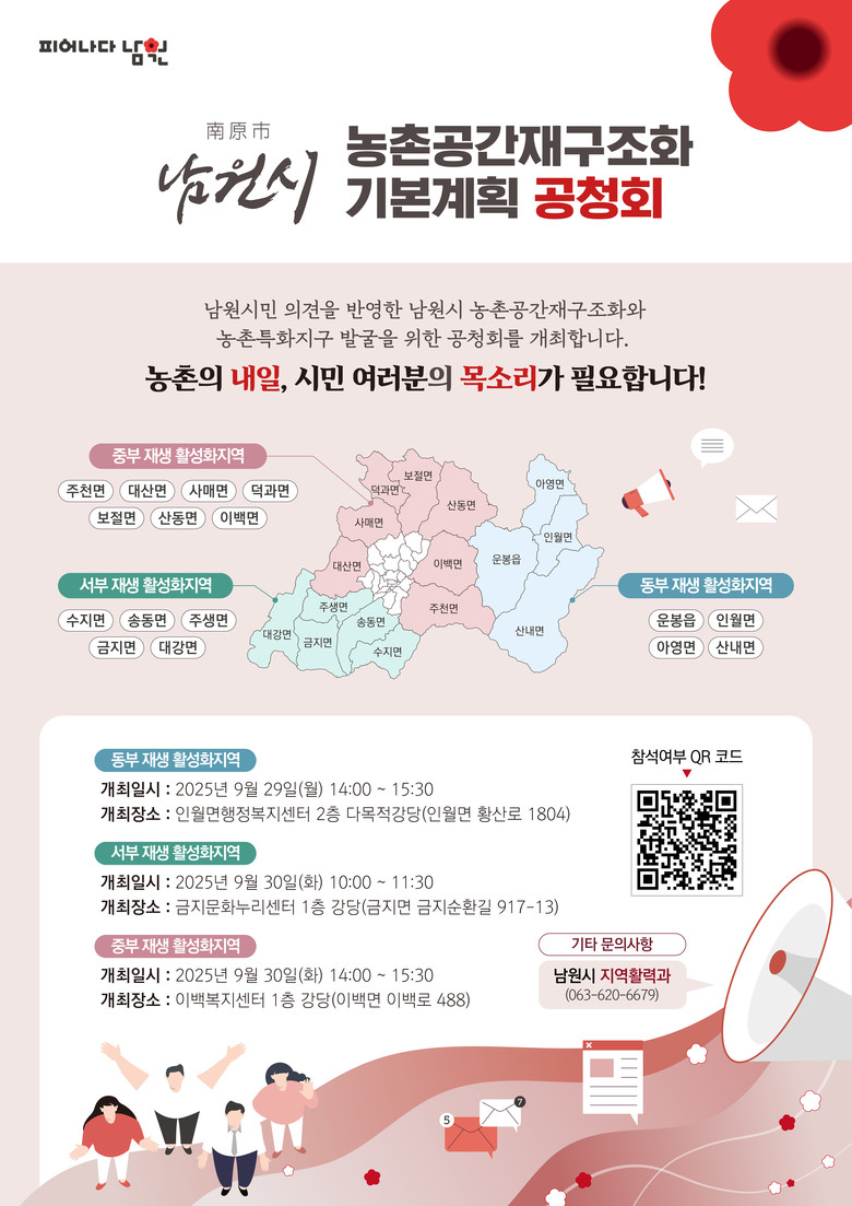 공청회는 사업이 진행되는 동부·중부·서부 3개 지구별로 각각 개최되며, 운봉읍, 인월면, 아영면, 산내면을 포함하는 ▲동부권역은 9월 29일 월요일 14시 인월면 행정복지센터 2층에서 개최될 예정이며, 수지면, 송동면, 주생면, 금지면, 대강면을 포함하는 ▲서부권역은 9월 30일 화요일 10시에 금지누리센터에서 진행되며, 주천면, 대산면, 사매면, 덕과면, 보절면, 이백면, 산동면을 포함하는 ▲중부권역은 같은 날 14시 이백 복지센터에서 진행될 예정이다.