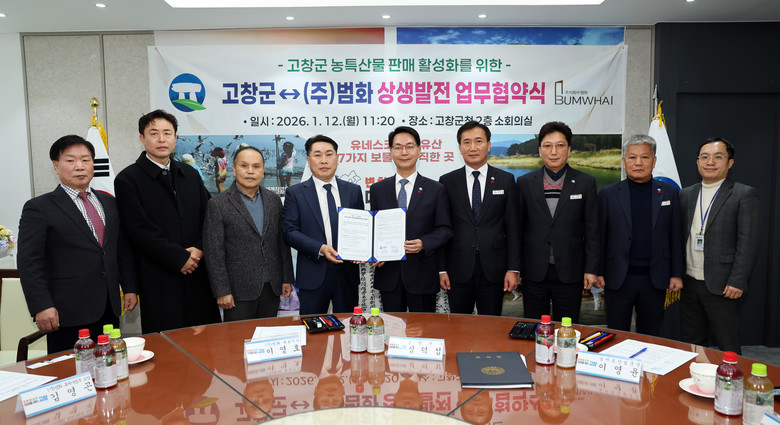 12일 고창군에 따르면 이날 중부고속도로에서 휴게소를 운영중인 (주)범화(대표 이영호)와 ‘고창군 농특산품 판매 활성화 및 홍보를 위한 상생발전 업무협약(MOU)’을 체결했다.